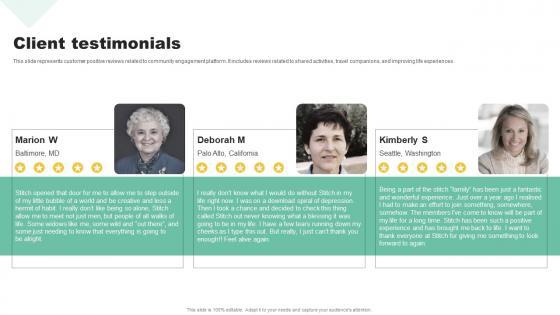 This slide represents customer positive reviews related to community engagement platform. It includes reviews related to shared activities, travel companions, and improving life experiences. Are you searching for a Client Testimonials Social Community Management Solution Funding Pitch Presentation Infographics Pdf that is uncluttered, straightforward, and original Its easy to edit, and you can change the colors to suit your personal or business branding. For a presentation that expresses how much effort you have put in, this template is ideal With all of its features, including tables, diagrams, statistics, and lists, its perfect for a business plan presentation. Make your ideas more appealing with these professional slides. Download Client Testimonials Social Community Management Solution Funding Pitch Presentation Infographics Pdf from Slidegeeks today. This slide represents customer positive reviews related to community engagement platform. It includes reviews related to shared activities, travel companions, and improving life experiences.
