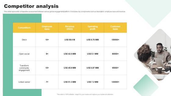 This slide represents comparative assessment between various global engagement platform. It includes key components such as description, employee base and revenue. Slidegeeks has constructed Competitor Analysis Social Community Management Solution Funding Pitch Presentation Sample Pdf after conducting extensive research and examination. These presentation templates are constantly being generated and modified based on user preferences and critiques from editors. Here, you will find the most attractive templates for a range of purposes while taking into account ratings and remarks from users regarding the content. This is an excellent jumping off point to explore our content and will give new users an insight into our top notch PowerPoint Templates. This slide represents comparative assessment between various global engagement platform. It includes key components such as description, employee base and revenue.