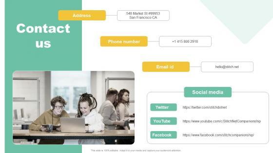 Presenting this PowerPoint presentation, titled Contact Us Social Community Management Solution Funding Pitch Presentation Download Pdf, with topics curated by our researchers after extensive research. This editable presentation is available for immediate download and provides attractive features when used. Download now and captivate your audience. Presenting this Contact Us Social Community Management Solution Funding Pitch Presentation Download Pdf. Our researchers have carefully researched and created these slides with all aspects taken into consideration. This is a completely customizable Contact Us Social Community Management Solution Funding Pitch Presentation Download Pdf that is available for immediate downloading. Download now and make an impact on your audience. Highlight the attractive features available with our PPTs. Our Contact Us Social Community Management Solution Funding Pitch Presentation Download Pdf are topically designed to provide an attractive backdrop to any subject. Use them to look like a presentation pro.