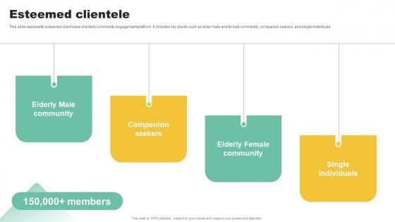 This slide represents esteemed client base of elderly community engagement platform. It includes key clients such as elder male and female community, companion seekers, and single individuals. This Esteemed Clientele Social Community Management Solution Funding Pitch Presentation Introduction Pdf from Slidegeeks makes it easy to present information on your topic with precision. It provides customization options, so you can make changes to the colors, design, graphics, or any other component to create a unique layout. It is also available for immediate download, so you can begin using it right away. Slidegeeks has done good research to ensure that you have everything you need to make your presentation stand out. Make a name out there for a brilliant performance. This slide represents esteemed client base of elderly community engagement platform. It includes key clients such as elder male and female community, companion seekers, and single individuals.