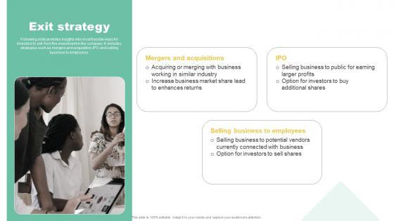 Following slide provides insights into most feasible ways for investors to exit from the investment in the company. It includes strategies such as mergers and acquisition, IPO and selling business to employees. Take your projects to the next level with our ultimate collection of Exit Strategy Social Community Management Solution Funding Pitch Presentation Icons Pdf. Slidegeeks has designed a range of layouts that are perfect for representing task or activity duration, keeping track of all your deadlines at a glance. Tailor these designs to your exact needs and give them a truly corporate look with your own brand colors they will make your projects stand out from the rest Following slide provides insights into most feasible ways for investors to exit from the investment in the company. It includes strategies such as mergers and acquisition, IPO and selling business to employees.