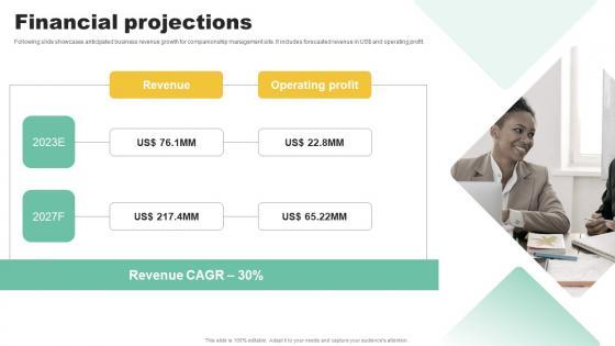Following slide showcases anticipated business revenue growth for companionship management site. It includes forecasted revenue in USdollar and operating profit. Find a pre designed and impeccable Financial Projections Social Community Management Solution Funding Pitch Presentation Brochure Pdf. The templates can ace your presentation without additional effort. You can download these easy to edit presentation templates to make your presentation stand out from others. So, what are you waiting for Download the template from Slidegeeks today and give a unique touch to your presentation. Following slide showcases anticipated business revenue growth for companionship management site. It includes forecasted revenue in USdollar and operating profit.