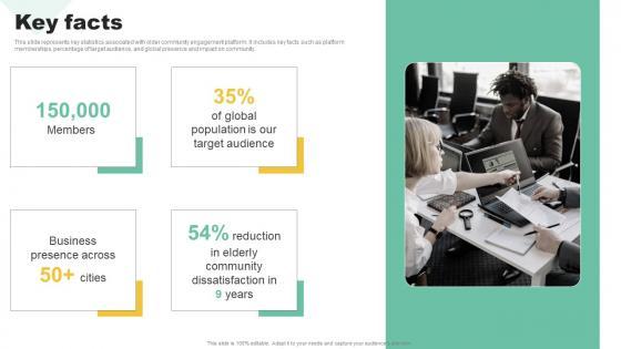 This slide represents key statistics associated with older community engagement platform. It includes key facts such as platform memberships, percentage of target audience, and global presence and impact on community. Slidegeeks is one of the best resources for PowerPoint templates. You can download easily and regulate Key Facts Social Community Management Solution Funding Pitch Presentation Download Pdf for your personal presentations from our wonderful collection. A few clicks is all it takes to discover and get the most relevant and appropriate templates. Use our Templates to add a unique zing and appeal to your presentation and meetings. All the slides are easy to edit and you can use them even for advertisement purposes. This slide represents key statistics associated with older community engagement platform. It includes key facts such as platform memberships, percentage of target audience, and global presence and impact on community.