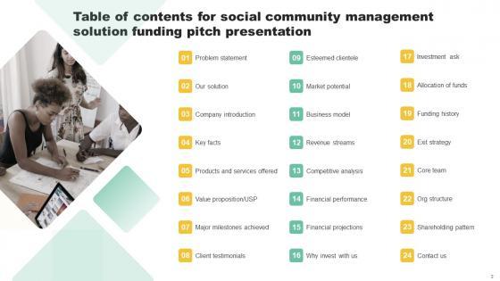 Whether you have daily or monthly meetings, a brilliant presentation is necessary. Table Of Contents For Social Community Management Solution Funding Pitch Presentation Infographics Pdf can be your best option for delivering a presentation. Represent everything in detail using Table Of Contents For Social Community Management Solution Funding Pitch Presentation Infographics Pdf and make yourself stand out in meetings. The template is versatile and follows a structure that will cater to your requirements. All the templates prepared by Slidegeeks are easy to download and edit. Our research experts have taken care of the corporate themes as well. So, give it a try and see the results. Our Table Of Contents For Social Community Management Solution Funding Pitch Presentation Infographics Pdf are topically designed to provide an attractive backdrop to any subject. Use them to look like a presentation pro.