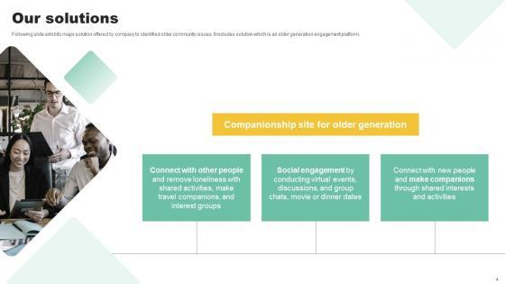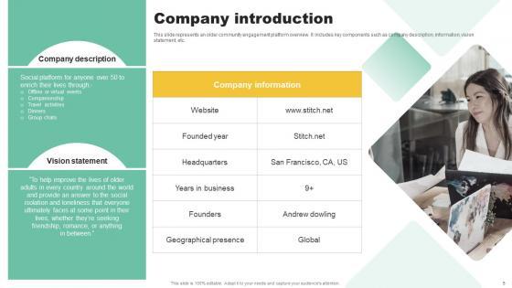 This slide represents an older community engagement platform overview. It includes key components such as company description, information, vision statement, etc. Retrieve professionally designed Company Introduction Social Community Management Solution Funding Pitch Presentation Designs Pdf to effectively convey your message and captivate your listeners. Save time by selecting pre made slideshows that are appropriate for various topics, from business to educational purposes. These themes come in many different styles, from creative to corporate, and all of them are easily adjustable and can be edited quickly. Access them as PowerPoint templates or as Google Slides themes. You do not have to go on a hunt for the perfect presentation because Slidegeeks got you covered from everywhere. This slide represents an older community engagement platform overview. It includes key components such as company description, information, vision statement, etc.