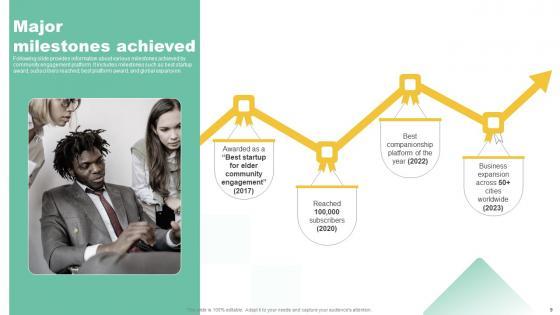 Following slide provides information about various milestones achieved by community engagement platform. It includes milestones such as best startup award, subscribers reached, best platform award, and global expansion. Want to ace your presentation in front of a live audience Our Major Milestones Achieved Social Community Management Solution Funding Pitch Elements Pdf can help you do that by engaging all the users towards you. Slidegeeks experts have put their efforts and expertise into creating these impeccable powerpoint presentations so that you can communicate your ideas clearly. Moreover, all the templates are customizable, and easy to edit and downloadable. Use these for both personal and commercial use. Following slide provides information about various milestones achieved by community engagement platform. It includes milestones such as best startup award, subscribers reached, best platform award, and global expansion.