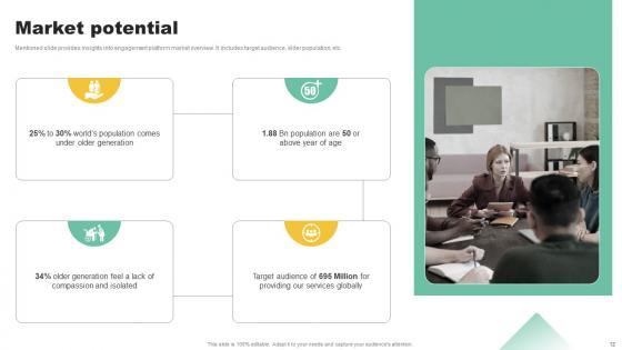 Mentioned slide provides insights into engagement platform market overview. It includes target audience, elder population, etc. There are so many reasons you need a Market Potential Social Community Management Solution Funding Pitch Presentation Microsoft Pdf. The first reason is you can not spend time making everything from scratch, Thus, Slidegeeks has made presentation templates for you too. You can easily download these templates from our website easily. Mentioned slide provides insights into engagement platform market overview. It includes target audience, elder population, etc.