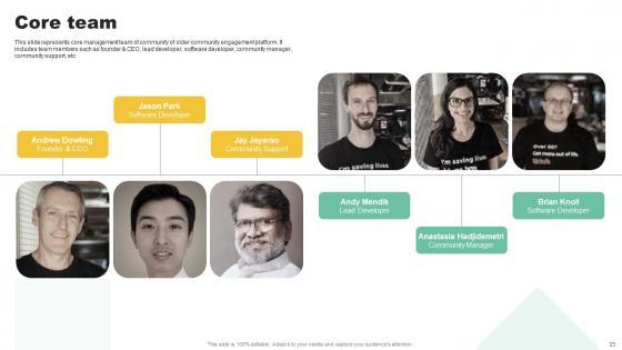 This slide represents core management team of community of older community engagement platform. It includes team members such as founder and CEO, lead developer, software developer, community manager, community support, etc. Here you can discover an assortment of the finest PowerPoint and Google Slides templates. With these templates, you can create presentations for a variety of purposes while simultaneously providing your audience with an eye catching visual experience. Download Core Team Social Community Management Solution Funding Pitch Presentation Designs Pdf to deliver an impeccable presentation. These templates will make your job of preparing presentations much quicker, yet still, maintain a high level of quality. Slidegeeks has experienced researchers who prepare these templates and write high quality content for you. Later on, you can personalize the content by editing the Core Team Social Community Management Solution Funding Pitch Presentation Designs Pdf. This slide represents core management team of community of older community engagement platform. It includes team members such as founder and CEO, lead developer, software developer, community manager, community support, etc.