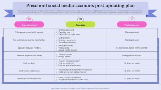 This slide outlines a plan showing types of content to be updated on preschool social media accounts to improve digital performance of business. It showcase content such as educational resources for parents, fun activities and learning opportunities, special events and holidays, seasonal programs and events, staff highlights, testimonials and reviews, behind the scene glimpses. Explore a selection of the finest Pre School Marketing Strategy To Enhance Enrollment Rate Preschool Social Media Accounts Post Rules PDF here. With a plethora of professionally designed and pre made slide templates, you can quickly and easily find the right one for your upcoming presentation. You can use our Pre School Marketing Strategy To Enhance Enrollment Rate Preschool Social Media Accounts Post Rules PDF to effectively convey your message to a wider audience. Slidegeeks has done a lot of research before preparing these presentation templates. The content can be personalized and the slides are highly editable. Grab templates today from Slidegeeks.