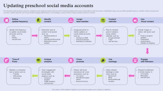 The following slide presents a plan for updating social media accounts of preschool for improving digital performance and positive customer reviews. It highlights steps such as define update frequency, identify content, assign team member, content calendar, use visual content, engage with followers, use hashtags, cross promote, analyze analytics and tone of posts. There are so many reasons you need a Pre School Marketing Strategy To Enhance Enrollment Rate Updating Preschool Social Media Accounts Information PDF. The first reason is you can not spend time making everything from scratch, Thus, Slidegeeks has made presentation templates for you too. You can easily download these templates from our website easily.