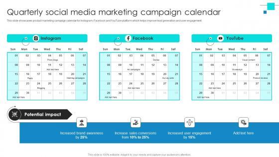 This slide showcases product marketing campaign calendar for Instagram, Facebook and YouTube platform which helps improve lead generation and user engagement. Find a pre-designed and impeccable Marketing Project Performance Benchmarking Quarterly Social Media Marketing CRP SS V. The templates can ace your presentation without additional effort. You can download these easy-to-edit presentation templates to make your presentation stand out from others. So, what are you waiting for Download the template from Slidegeeks today and give a unique touch to your presentation. This slide showcases product marketing campaign calendar for Instagram, Facebook and YouTube platform which helps improve lead generation and user engagement.