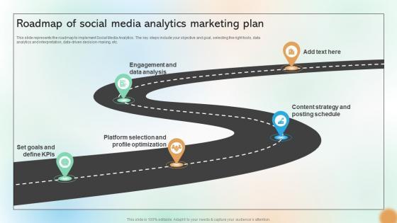 This slide represents the roadmap to implement Social Media Analytics. The key steps include your objective and goal, selecting the right tools, data analytics and interpretation, data driven decision making, etc. Boost your pitch with our creative Roadmap Of Social Media Analytics Marketing Plan Cracking The Code Of Social Media. Deliver an awe-inspiring pitch that will mesmerize everyone. Using these presentation templates you will surely catch everyones attention. You can browse the ppts collection on our website. We have researchers who are experts at creating the right content for the templates. So you do not have to invest time in any additional work. Just grab the template now and use them. This slide represents the roadmap to implement Social Media Analytics. The key steps include your objective and goal, selecting the right tools, data analytics and interpretation, data driven decision making, etc.