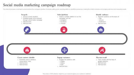 This slide showcases a roadmap to set and achieve the campaign objective. It includes setting goals, selecting platforms, identifying audiences, creating the content schedule, encouraging customers and measuring results. The best PPT templates are a great way to save time, energy, and resources. Slidegeeks have 100 percent editable powerpoint slides making them incredibly versatile. With these quality presentation templates, you can create a captivating and memorable presentation by combining visually appealing slides and effectively communicating your message. Download Social Media Marketing Campaign Roadmap Themes PDF from Slidegeeks and deliver a wonderful presentation.