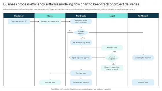 Following slide shows the Flowchart for BPM software modelling the project which assist in better organisational control. The process starts form customer submit PO and ends with order delivered Showcasing this set of slides titled Business Process Efficiency Software Modeling Flow Chart To Keep Track Of Project Deliveries Template Pdf The topics addressed in these templates are Customer Submits, Business Process, Efficiency Software All the content presented in this PPT design is completely editable. Download it and make adjustments in color, background, font etc. as per your unique business setting. Following slide shows the Flowchart for BPM software modelling the project which assist in better organisational control. The process starts form customer submit PO and ends with order delivered