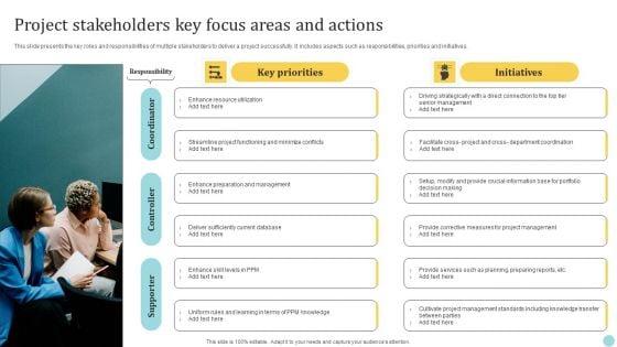 This slide presents the key roles and responsibilities of multiple stakeholders to deliver a project successfully. It includes aspects such as responsibilities, priorities and initiatives. Presenting Project Stakeholders Key Focus Areas And Actions Topics PDF to dispense important information. This template comprises one stages. It also presents valuable insights into the topics including Supporter, Controller, Coordinator. This is a completely customizable PowerPoint theme that can be put to use immediately. So, download it and address the topic impactfully.
