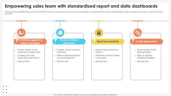 This slide showcases different types of reports that help the sales team view performance and drive business insights, encompassing reports such as activities logged by sales managers, product demos, deal won and leads generated. Coming up with a presentation necessitates that the majority of the effort goes into the content and the message you intend to convey. The visuals of a PowerPoint presentation can only be effective if it supplements and supports the story that is being told. Keeping this in mind our experts created Business Development Team Empowering Sales Team With Standardised Report SA SS V to reduce the time that goes into designing the presentation. This way, you can concentrate on the message while our designers take care of providing you with the right template for the situation. This slide showcases different types of reports that help the sales team view performance and drive business insights, encompassing reports such as activities logged by sales managers, product demos, deal won and leads generated.