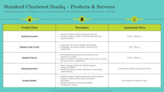 This slide defines the best Islamic financial institutions in the world. It includes details related to the Standard Chartered Saadiq considered the best sukuk and Islamic investment bank. This modern and well-arranged In Depth Analysis Of Islamic Banking Standard Chartered Saadiq Products And Services Inspiration PDF provides lots of creative possibilities. It is very simple to customize and edit with the Powerpoint Software. Just drag and drop your pictures into the shapes. All facets of this template can be edited with Powerpoint no extra software is necessary. Add your own material, put your images in the places assigned for them, adjust the colors, and then you can show your slides to the world, with an animated slide included. This slide defines the best Islamic financial institutions in the world. It includes details related to the Standard Chartered Saadiq considered the best sukuk and Islamic investment bank.