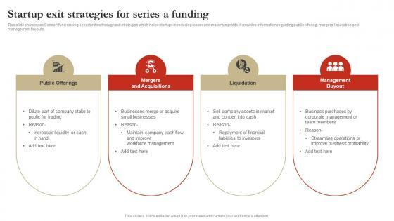 This slide showcases Series A fund raising opportunities through exit strategies which helps startups in reducing losses and maximize profits. It provides information regarding public offering, mergers, liquidation and management buyouts. Pitch your topic with ease and precision using this Startup Exit Strategies For Series A Funding Graphics Pdf. This layout presents information on Public Offerings, Mergers And Acquisitions, Liquidation. It is also available for immediate download and adjustment. So, changes can be made in the color, design, graphics or any other component to create a unique layout. This slide showcases Series A fund raising opportunities through exit strategies which helps startups in reducing losses and maximize profits. It provides information regarding public offering, mergers, liquidation and management buyouts.