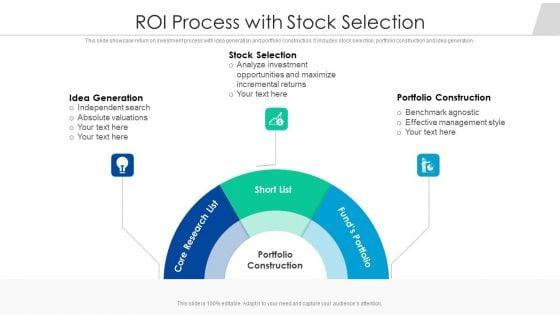 Presenting roi process with stock selection ppt powerpoint presentation outline designs download pdf to dispense important information. This template comprises three stages. It also presents valuable insights into the topics including idea generation, stock selection, portfolio construction. This is a completely customizable PowerPoint theme that can be put to use immediately. So, download it and address the topic impactfully.