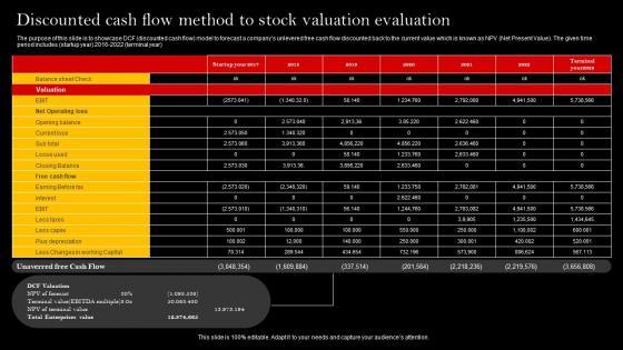 The purpose of this slide is to showcase DCF discounted cash flow model to forecast a companys unlevered free cash flow discounted back to the current value which is known as NPV Net Present Value. The given time period includes startup year 2016-2022 terminal year Pitch your topic with ease and precision using this Discounted Cash Flow Method To Stock Valuation Evaluation Summary Pdf This layout presents information on Cash Flow Method, Stock Valuation Evaluation It is also available for immediate download and adjustment. So, changes can be made in the color, design, graphics or any other component to create a unique layout. The purpose of this slide is to showcase DCF discounted cash flow model to forecast a companys unlevered free cash flow discounted back to the current value which is known as NPV Net Present Value. The given time period includes startup year 2016-2022 terminal year