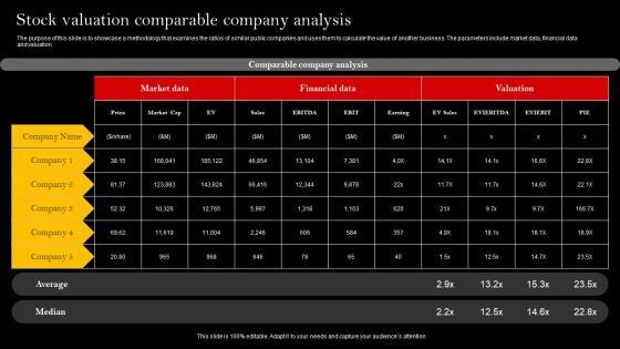 Present like a pro with Stock Valuation Comparable Company Analysis. Create beautiful presentations together with your team, using our easy-to-use presentation slides. Share your ideas in real-time and make changes on the fly by downloading our templates. So whether you are in the office, on the go, or in a remote location, you can stay in sync with your team and present your ideas with confidence. With Slidegeeks presentation got a whole lot easier. Grab these presentations today. The purpose of slide is to represent methodology that evaluate ratios of similar public companies and utilize them to calculate value of another business. The parameters involves market data, financial data and valuation.
