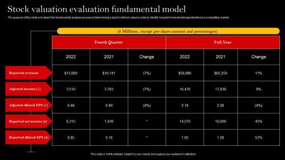 The purpose of this slide is to depict the fundamental analysis process of determining a stocks intrinsic value in order to identify long-term investment opportunities in a competitive market. Showcasing this set of slides titled Stock Valuation Evaluation Fundamental Model Microsoft Pdf The topics addressed in these templates are Reported Revenues, Adjusted Income, Adjusted Diluted All the content presented in this PPT design is completely editable. Download it and make adjustments in color, background, font etc. as per your unique business setting. The purpose of this slide is to depict the fundamental analysis process of determining a stocks intrinsic value in order to identify long-term investment opportunities in a competitive market.