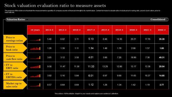 The purpose of this slide is to illustrate the measurement or quantity of company assets or financial strength to its market value. Certain formulas to valuate ratios include price to earing ratio, price to book ration, price to cash ratio etc. Pitch your topic with ease and precision using this Stock Valuation Evaluation Ratio To Measure Assets Introduction Pdf This layout presents information on Earnings Ration, Market Cap To Sales Ratio It is also available for immediate download and adjustment. So, changes can be made in the color, design, graphics or any other component to create a unique layout. The purpose of this slide is to illustrate the measurement or quantity of company assets or financial strength to its market value. Certain formulas to valuate ratios include price to earing ratio, price to book ration, price to cash ratio etc.