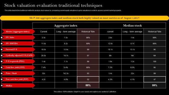 This slide depicts the traditional method to analyze stock values by comparing current equity valuations to prior valuations in order to assess current market prospects. Showcasing this set of slides titled Stock Valuation Evaluation Traditional Techniques Guidelines Pdf The topics addressed in these templates are Metric, Cyclically Adjusted, Growth All the content presented in this PPT design is completely editable. Download it and make adjustments in color, background, font etc. as per your unique business setting. This slide depicts the traditional method to analyze stock values by comparing current equity valuations to prior valuations in order to assess current market prospects.