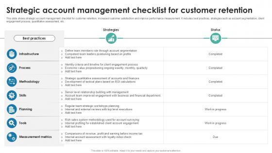 This slide shows strategic account management checklist for customer retention, increased customer satisfaction and improve performance measurement. It includes best practices, strategies such as account segmentation, client engagement process, quantitative assessment, etc. Formulating a presentation can take up a lot of effort and time, so the content and message should always be the primary focus. The visuals of the PowerPoint can enhance the presenters message, so our Strategic Account Management Checklist For Customer Retention PPT Example SS was created to help save time. Instead of worrying about the design, the presenter can concentrate on the message while our designers work on creating the ideal templates for whatever situation is needed. Slidegeeks has experts for everything from amazing designs to valuable content, we have put everything into Strategic Account Management Checklist For Customer Retention PPT Example SS This slide shows strategic account management checklist for customer retention, increased customer satisfaction and improve performance measurement. It includes best practices, strategies such as account segmentation, client engagement process, quantitative assessment, etc.