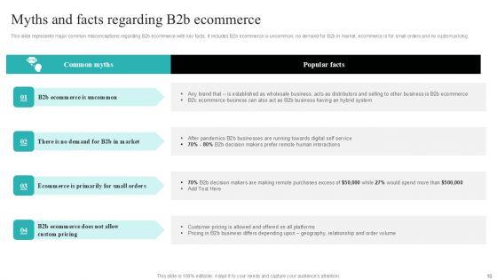This slide represents major common misconceptions regarding B2b ecommerce with key facts. It includes B2b ecommerce is uncommon, no demand for B2b in market, ecommerce is for small orders and no custom pricing. Make sure to capture your audiences attention in your business displays with our gratis customizable Strategic Ecommerce Plan For B2B Enterprises Myths And Facts Regarding B2b Ecommerce Diagrams PDF. These are great for business strategies, office conferences, capital raising or task suggestions. If you desire to acquire more customers for your tech business and ensure they stay satisfied, create your own sales presentation with these plain slides.