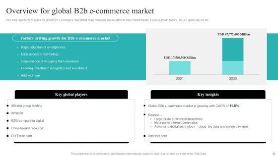 This slide represents overview for global B2b e-commerce market that helps marketers and investors to track market trends. It covers growth factors , CAGR, global players etc. Welcome to our selection of the Strategic Ecommerce Plan For B2B Enterprises Overview For Global B2b E Commerce Market Template PDF. These are designed to help you showcase your creativity and bring your sphere to life. Planning and Innovation are essential for any business that is just starting out. This collection contains the designs that you need for your everyday presentations. All of our PowerPoints are 100 percent editable, so you can customize them to suit your needs. This multi-purpose template can be used in various situations. Grab these presentation templates today