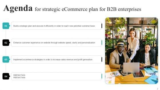 This modern and well-arranged Agenda For Strategic Ecommerce Plan For B2B Enterprises Slides PDF provides lots of creative possibilities. It is very simple to customize and edit with the Powerpoint Software. Just drag and drop your pictures into the shapes. All facets of this template can be edited with Powerpoint, no extra software is necessary. Add your own material, put your images in the places assigned for them, adjust the colors, and then you can show your slides to the world, with an animated slide included.