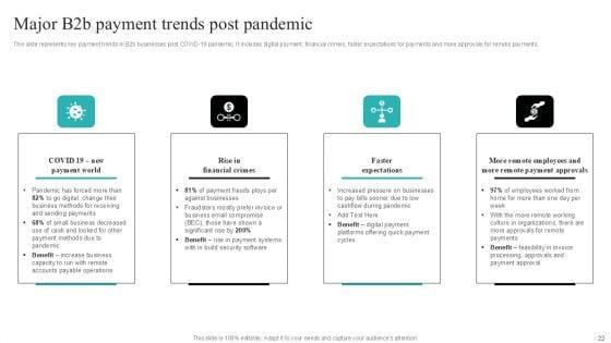 This slide represents key payment trends in B2b businesses post COVID-19 pandemic. It includes digital payment, financial crimes, faster expectations for payments and more approvals for remote payments. Find highly impressive Strategic Ecommerce Plan For B2B Enterprises Major B2b Payment Trends Post Pandemic Ideas PDF on Slidegeeks to deliver a meaningful presentation. You can save an ample amount of time using these presentation templates. No need to worry to prepare everything from scratch because Slidegeeks experts have already done a huge research and work for you. You need to download Strategic Ecommerce Plan For B2B Enterprises Major B2b Payment Trends Post Pandemic Ideas PDF for your upcoming presentation. All the presentation templates are 100 percent editable and you can change the color and personalize the content accordingly. Download now