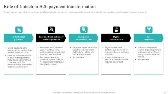 This slide represents ways fintech has transformed global B2b business payment system. It includes instant global payment, real time fraud and money laundering system, transparent movement of money etc. The best PPT templates are a great way to save time, energy, and resources. Slidegeeks have 100 percent editable powerpoint slides making them incredibly versatile. With these quality presentation templates, you can create a captivating and memorable presentation by combining visually appealing slides and effectively communicating your message. Download Strategic Ecommerce Plan For B2B Enterprises Role Of Fintech In B2b Payment Transformation Mockup PDF from Slidegeeks and deliver a wonderful presentation.