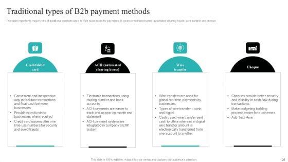 This slide represents major types of traditional methods used by B2b businesses for payments. It covers credit debit cards, automated clearing house, wire transfer and cheque. Do you know about Slidesgeeks Strategic Ecommerce Plan For B2B Enterprises Traditional Types Of B2b Payment Methods Icons PDF These are perfect for delivering any kind od presentation. Using it, create PowerPoint presentations that communicate your ideas and engage audiences. Save time and effort by using our pre-designed presentation templates that are perfect for a wide range of topic. Our vast selection of designs covers a range of styles, from creative to business, and are all highly customizable and easy to edit. Download as a PowerPoint template or use them as Google Slides themes.