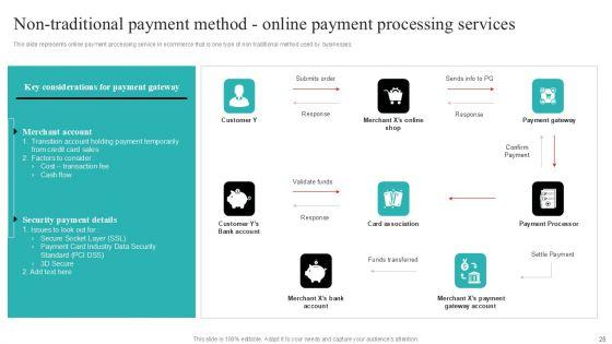 This slide represents online payment processing service in ecommerce that is one type of non traditional method used by businesses. Coming up with a presentation necessitates that the majority of the effort goes into the content and the message you intend to convey. The visuals of a PowerPoint presentation can only be effective if it supplements and supports the story that is being told. Keeping this in mind our experts created Strategic Ecommerce Plan For B2B Enterprises Non Traditional Payment Method Online Payment Professional PDF to reduce the time that goes into designing the presentation. This way, you can concentrate on the message while our designers take care of providing you with the right template for the situation.