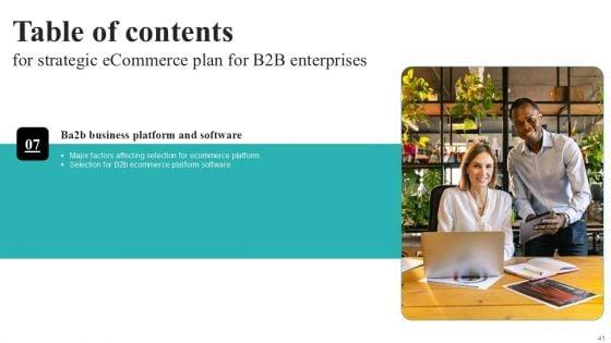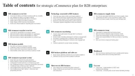 Find a pre-designed and impeccable Table Of Contents For Strategic Ecommerce Plan For B2B Enterprises Pictures PDF. The templates can ace your presentation without additional effort. You can download these easy-to-edit presentation templates to make your presentation stand out from others. So, what are you waiting for Download the template from Slidegeeks today and give a unique touch to your presentation.