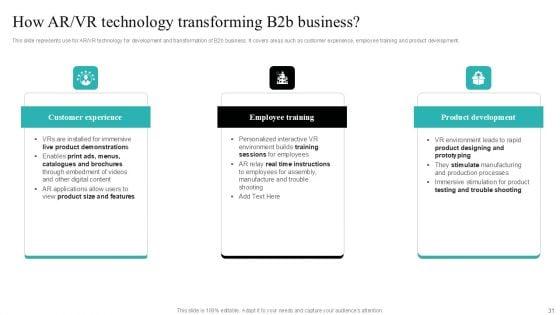 This slide represents use for AR VR technology for development and transformation of B2b business. It covers areas such as customer experience, employee training and product development. Do you have to make sure that everyone on your team knows about any specific topic I yes, then you should give Strategic Ecommerce Plan For B2B Enterprises How AR VR Technology Transforming B2b Business Background PDF a try. Our experts have put a lot of knowledge and effort into creating this impeccable Strategic Ecommerce Plan For B2B Enterprises How AR VR Technology Transforming B2b Business Background PDF. You can use this template for your upcoming presentations, as the slides are perfect to represent even the tiniest detail. You can download these templates from the Slidegeeks website and these are easy to edit. So grab these today