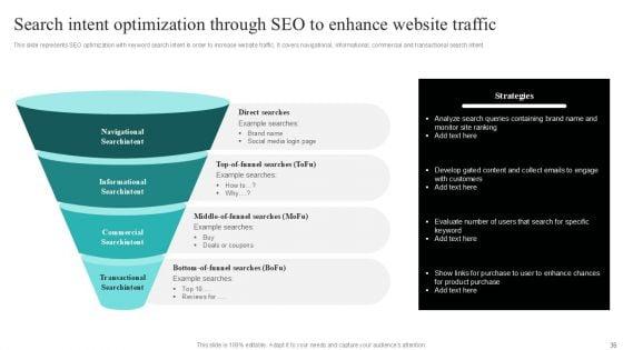 This slide represents SEO optimization with keyword search intent in order to increase website traffic. It covers navigational, informational, commercial and transactional search intent. Retrieve professionally designed Strategic Ecommerce Plan For B2B Enterprises Search Intent Optimization Through SEO To Enhance Website Traffic Information PDF to effectively convey your message and captivate your listeners. Save time by selecting pre-made slideshows that are appropriate for various topics, from business to educational purposes. These themes come in many different styles, from creative to corporate, and all of them are easily adjustable and can be edited quickly. Access them as PowerPoint templates or as Google Slides themes. You do not have to go on a hunt for the perfect presentation because Slidegeeks got you covered from everywhere.