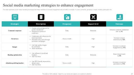 This slide represents social media marketing techniques that helps marketers to increase engagement rate and traffic on website. It covers comments, giveaways, images, heading optimization etc. Here you can discover an assortment of the finest PowerPoint and Google Slides templates. With these templates, you can create presentations for a variety of purposes while simultaneously providing your audience with an eye-catching visual experience. Download Strategic Ecommerce Plan For B2B Enterprises Social Media Marketing Strategies To Enhance Engagement Professional PDF to deliver an impeccable presentation. These templates will make your job of preparing presentations much quicker, yet still, maintain a high level of quality. Slidegeeks has experienced researchers who prepare these templates and write high-quality content for you. Later on, you can personalize the content by editing the Strategic Ecommerce Plan For B2B Enterprises Social Media Marketing Strategies To Enhance Engagement Professional PDF.