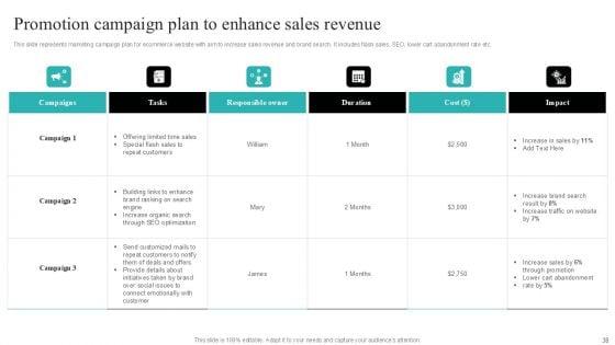 This slide represents marketing campaign plan for ecommerce website with aim to increase sales revenue and brand search. It includes flash sales, SEO, lower cart abandonment rate etc. Explore a selection of the finest Strategic Ecommerce Plan For B2B Enterprises Promotion Campaign Plan To Enhance Sales Revenue Elements PDF here. With a plethora of professionally designed and pre-made slide templates, you can quickly and easily find the right one for your upcoming presentation. You can use our Strategic Ecommerce Plan For B2B Enterprises Promotion Campaign Plan To Enhance Sales Revenue Elements PDF to effectively convey your message to a wider audience. Slidegeeks has done a lot of research before preparing these presentation templates. The content can be personalized and the slides are highly editable. Grab templates today from Slidegeeks.