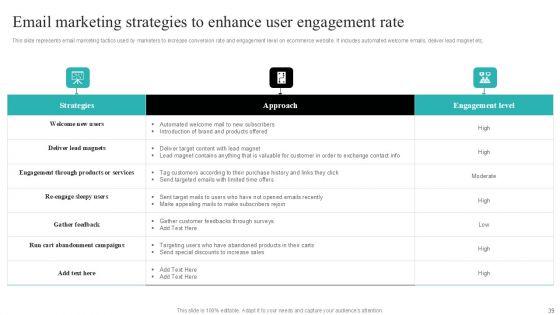 This slide represents email marketing tactics used by marketers to increase conversion rate and engagement level on ecommerce website. It includes automated welcome emails, deliver lead magnet etc. There are so many reasons you need a Strategic Ecommerce Plan For B2B Enterprises Email Marketing Strategies To Enhance User Engagement Rate Ideas PDF. The first reason is you can not spend time making everything from scratch, Thus, Slidegeeks has made presentation templates for you too. You can easily download these templates from our website easily.