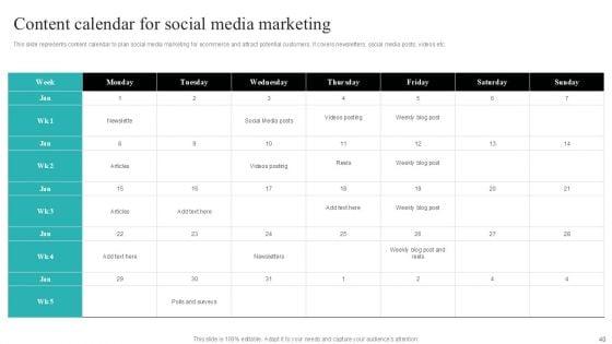 This slide represents content calendar to plan social media marketing for ecommerce and attract potential customers. It covers newsletters, social media posts, videos etc. Create an editable Strategic Ecommerce Plan For B2B Enterprises Content Calendar For Social Media Marketing Rules PDF that communicates your idea and engages your audience. Whether you are presenting a business or an educational presentation, pre-designed presentation templates help save time. Strategic Ecommerce Plan For B2B Enterprises Content Calendar For Social Media Marketing Rules PDF is highly customizable and very easy to edit, covering many different styles from creative to business presentations. Slidegeeks has creative team members who have crafted amazing templates. So, go and get them without any delay.