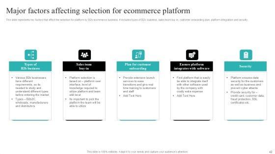This slide represents key factors that effect the selection for platform by B2b ecommerce business. It includes types of B2b business, sales team buy in, customer onboarding plan, platform integration and security. If your project calls for a presentation, then Slidegeeks is your go-to partner because we have professionally designed, easy-to-edit templates that are perfect for any presentation. After downloading, you can easily edit Strategic Ecommerce Plan For B2B Enterprises Major Factors Affecting Selection For Ecommerce Platform Ideas PDF and make the changes accordingly. You can rearrange slides or fill them with different images. Check out all the handy templates