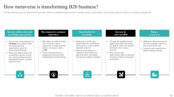 This slide represents ways and approaches through which metaverse is transforming B2b business. It includes increase in collaborations, more immersive customer experience, marketing opportunities etc. Get a simple yet stunning designed Strategic Ecommerce Plan For B2B Enterprises How Metaverse Is Transforming B2b Business Sample PDF. It is the best one to establish the tone in your meetings. It is an excellent way to make your presentations highly effective. So, download this PPT today from Slidegeeks and see the positive impacts. Our easy-to-edit Strategic Ecommerce Plan For B2B Enterprises How Metaverse Is Transforming B2b Business Sample PDF can be your go-to option for all upcoming conferences and meetings. So, what are you waiting for Grab this template today.