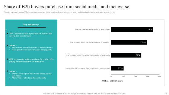 This slide represents share of B2b buyers making purchase due to social media and metaverse. It covers social media ads, live demonstration, video posts etc. Presenting this PowerPoint presentation, titled Strategic Ecommerce Plan For B2B Enterprises Share Of B2b Buyers Purchase From Social Media And Metaverse Topics PDF, with topics curated by our researchers after extensive research. This editable presentation is available for immediate download and provides attractive features when used. Download now and captivate your audience. Presenting this Strategic Ecommerce Plan For B2B Enterprises Share Of B2b Buyers Purchase From Social Media And Metaverse Topics PDF. Our researchers have carefully researched and created these slides with all aspects taken into consideration. This is a completely customizable Strategic Ecommerce Plan For B2B Enterprises Share Of B2b Buyers Purchase From Social Media And Metaverse Topics PDF that is available for immediate downloading. Download now and make an impact on your audience. Highlight the attractive features available with our PPTs.