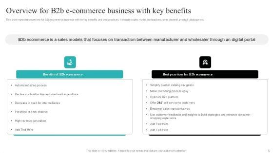 This slide represents overview for B2b ecommerce business with its key benefits and best practices. It includes sales model, transactions, omni channel, product catalogue etc. This Strategic Ecommerce Plan For B2B Enterprises Overview For B2b E Commerce Business With Key Benefits Themes PDF is perfect for any presentation, be it in front of clients or colleagues. It is a versatile and stylish solution for organizing your meetings. The Strategic Ecommerce Plan For B2B Enterprises Overview For B2b E Commerce Business With Key Benefits Themes PDF features a modern design for your presentation meetings. The adjustable and customizable slides provide unlimited possibilities for acing up your presentation. Slidegeeks has done all the homework before launching the product for you. So, do not wait, grab the presentation templates today