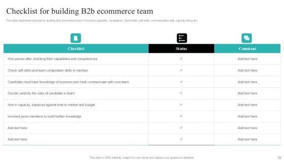 This slide represents checklist for building B2b ecommerce team. It involves capability, competency, team skills, soft skills, communication sills, capacity hiring etc. Do you know about Slidesgeeks Strategic Ecommerce Plan For B2B Enterprises Checklist For Building B2b Ecommerce Team Themes PDF These are perfect for delivering any kind od presentation. Using it, create PowerPoint presentations that communicate your ideas and engage audiences. Save time and effort by using our pre-designed presentation templates that are perfect for a wide range of topic. Our vast selection of designs covers a range of styles, from creative to business, and are all highly customizable and easy to edit. Download as a PowerPoint template or use them as Google Slides themes.