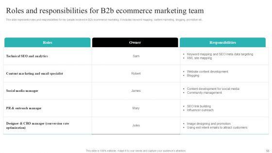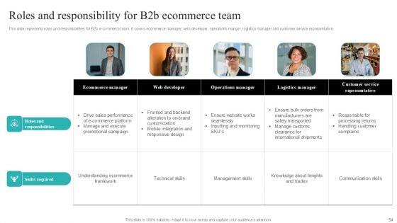 This slide represents roles and responsibilities for B2b e-commerce team. It covers ecommerce manager, web developer, operations manger, logistics manager and customer service representative. Are you searching for a Strategic Ecommerce Plan For B2B Enterprises Roles And Responsibility For B2b Ecommerce Team Graphics PDF that is uncluttered, straightforward, and original Its easy to edit, and you can change the colors to suit your personal or business branding. For a presentation that expresses how much effort you have put in, this template is ideal With all of its features, including tables, diagrams, statistics, and lists, its perfect for a business plan presentation. Make your ideas more appealing with these professional slides. Download Strategic Ecommerce Plan For B2B Enterprises Roles And Responsibility For B2b Ecommerce Team Graphics PDF from Slidegeeks today.