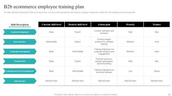 This slide represents training plan for B2b e-commerce team. It covers content development, data analytics, campaign management, website SEO and catalogue keyword management. Explore a selection of the finest Strategic Ecommerce Plan For B2B Enterprises B2b Ecommerce Employee Training Plan Clipart PDF here. With a plethora of professionally designed and pre-made slide templates, you can quickly and easily find the right one for your upcoming presentation. You can use our Strategic Ecommerce Plan For B2B Enterprises B2b Ecommerce Employee Training Plan Clipart PDF to effectively convey your message to a wider audience. Slidegeeks has done a lot of research before preparing these presentation templates. The content can be personalized and the slides are highly editable. Grab templates today from Slidegeeks.